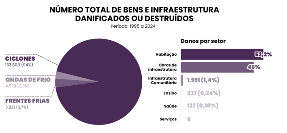 O setor público acumula cerca de R$ 200 milhões em perdas, concentradas principalmente nos setores de energia, transporte e distribuição, que têm sido fortemente impactados pelos ciclones. Já o setor privado registra R$ 2,5 bilhões em prejuízos, resultado sobretudo das ondas de frio, que afetam diretamente a agricultura e o comércio. Entre os bens danificados, habitações correspondem a 52% dos casos, enquanto obras de infraestrutura representam 46% do total de danos registrados.