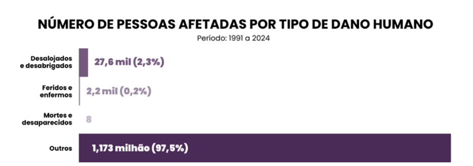 Desde 1991, os desastres analisados impactaram 1,2 milhão de pessoas no Brasil, com crescimento de 206% em relação à década anterior e quase 40 vezes mais que nos anos 1990. A média anual de pessoas afetadas hoje é três vezes maior do que a da década passada.