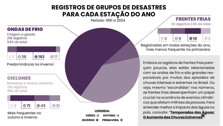 Entre 1991 a 2024, o Brasil registrou 407 desastres climáticos relacionados a frentes frias, ciclones e ondas de frio. A média anual saltou de 2,3 registros por ano nos anos 1990 para 44 registros anuais entre 2021 e 2024, um aumento de 240% em relação à década passada (2011 a 2020).